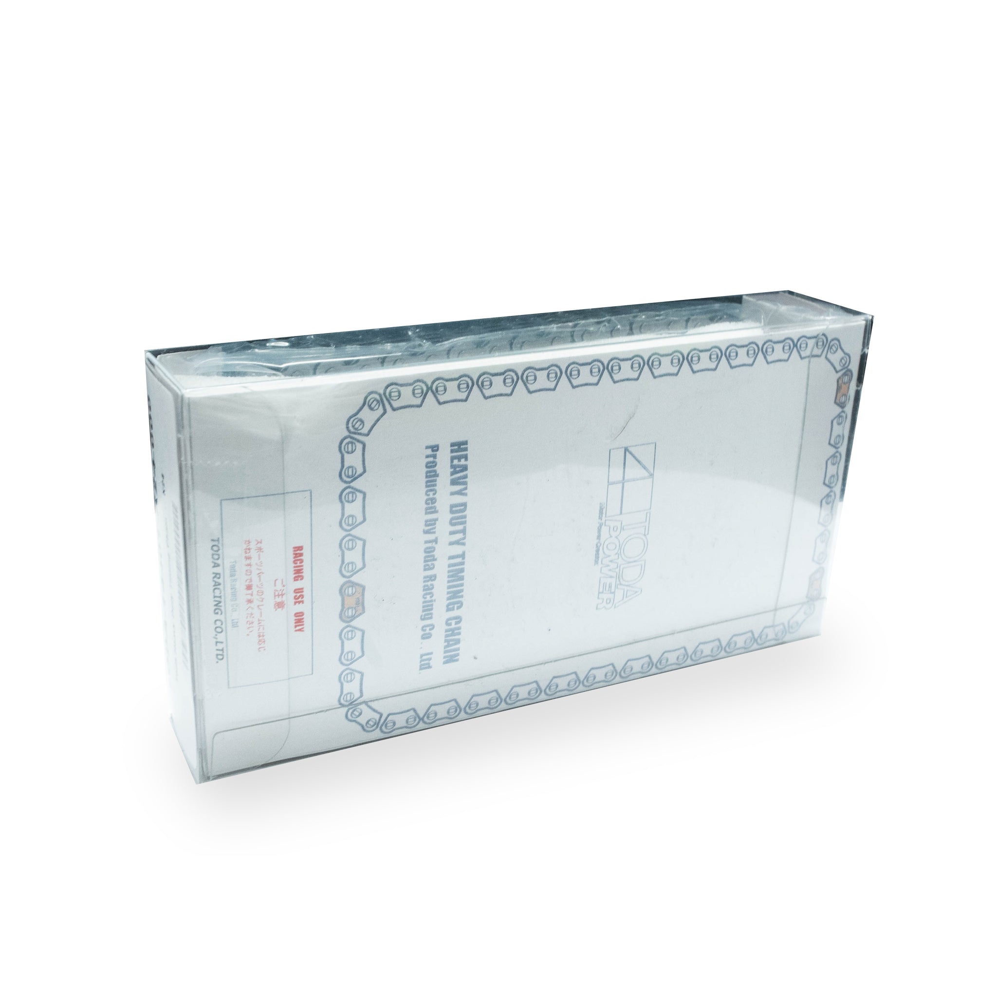 This is TODA Racing's Heavy Duty Timing Chain. With the extra demand of hi-performance driving even with the standard road engine and/or components such as camshafts that place extra stress on the valve train system, improved chain strength is important. The highly precise side plates reduce friction and improve the revolution fatigue strength by increasing the area of the plates, a reduction in the burrs and the finish to each individual plate. Moreover, due to the higher precision of manufacture, the hole size and shape in the plate have enabled the use of a larger diameter pin, this also contributes to reducing the stretching of the chain under constant high velocity revolutions by as much as 35%.