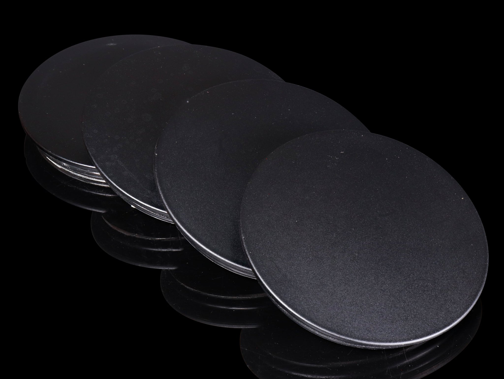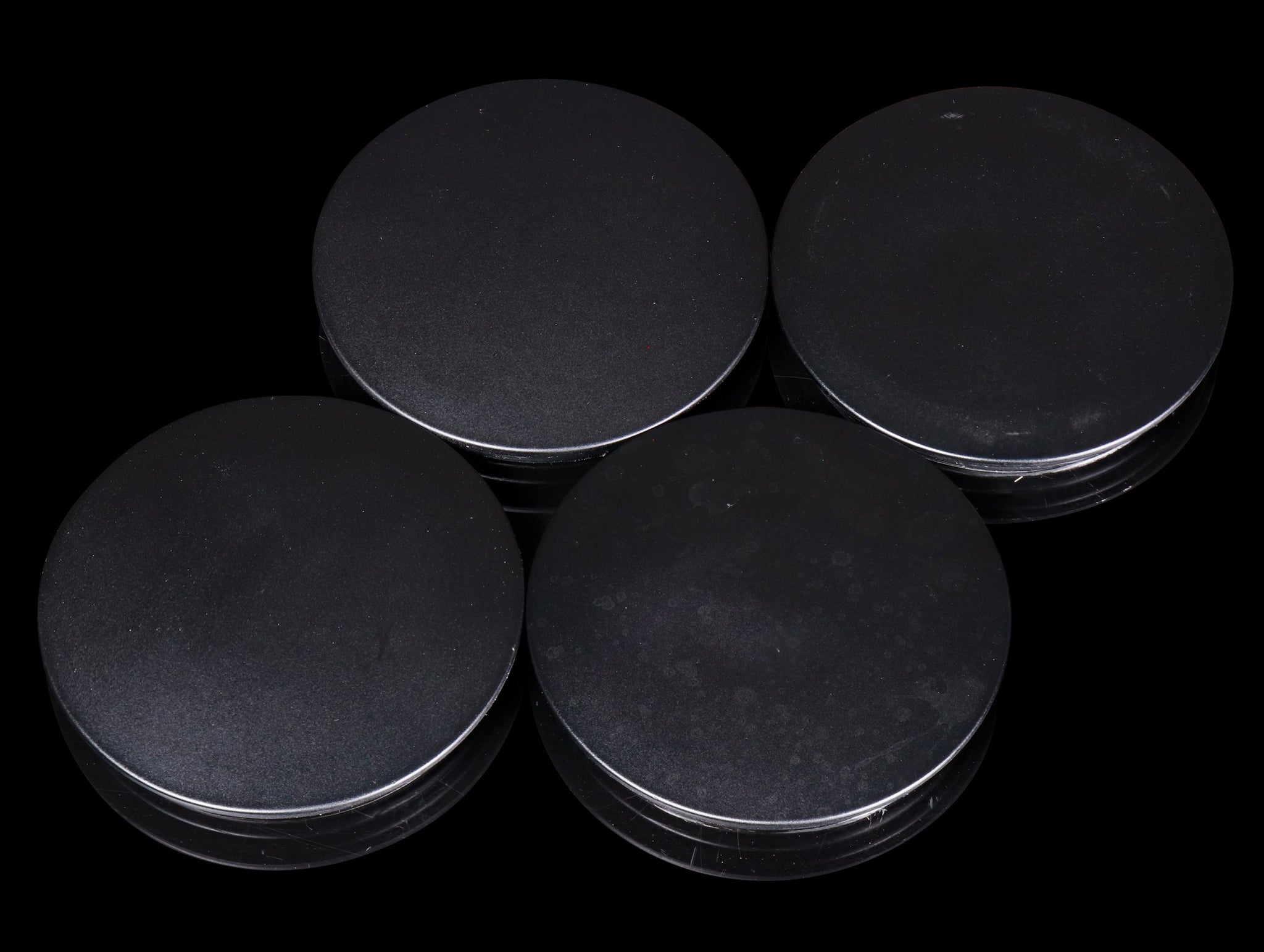 This is for a full set (4 pieces) of used Rays A-Flat Center Caps in Matte Flat Black. 1 cap exhibits some hard water spots, and 1 other cap exhibits some slight scuffs and scratches as shown in the photos.