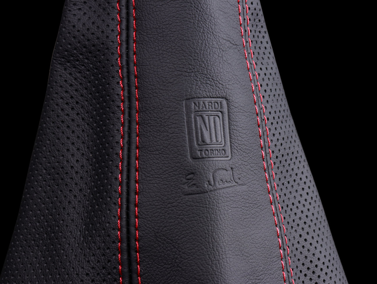 The Nardi leather Gaiter hand brake boot features smooth and perforated leather sections mated by red stitching with embossed Nardi logo.